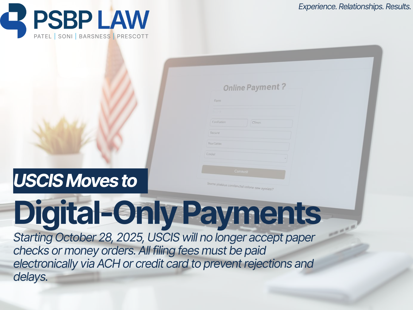 Effective October 28, 2025, USCIS will no longer accept paper checks or money orders for filing fees payments. This is due to Executive Order 14247, Modernizing Payments to and from America’s Bank Account. This order aims to move away from paper-based payments in favor of secure electronic methods to the risks of fraud, lost payments, and theft.